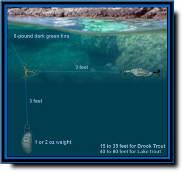 Please Note: The article below was originally written for Lake Trout fishing. The same technique can be used for Brook Trout, deep open-water Walleyes and for Northern Pike when they start to go deep in mid August. With Walleyes, use a worm harness or small Rapala. For Pike, use larger floating Lures like Jointed J-11 Rapalas. Big heavy spoons like Daredevils will not work well with this rig. The larger paper-thin trout spoons such as large Sutton Silver Spoons or Moose Spoons with attract big pike. With Brook Trout, use tiny spoons and spinners.